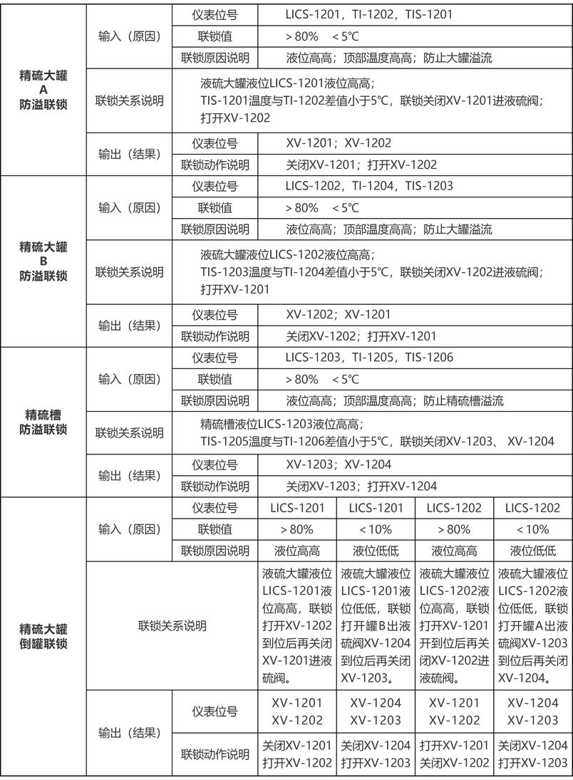精硫作為裝置生產的原料,為確保原料供應的穩定性和精硫罐的可靠性,通常會設計兩個精硫大罐用于儲存精制液硫。精硫大罐的容量根據裝置規模和儲存時間確定,基本的儲存時間應滿足15至30天的用量需求。根據精硫的儲存時間差,大罐還可以通過物理沉降的方式,使液硫中的雜質進一步沉淀至罐底,從而減少系統中的灰分含量。因此,實現精硫大罐的自動倒罐和罐、槽液位的自動控制顯得尤為重要。為此,我們專門設計了精硫大罐自動控制方案。