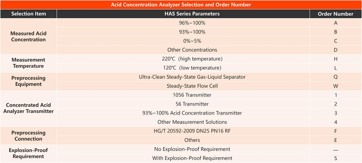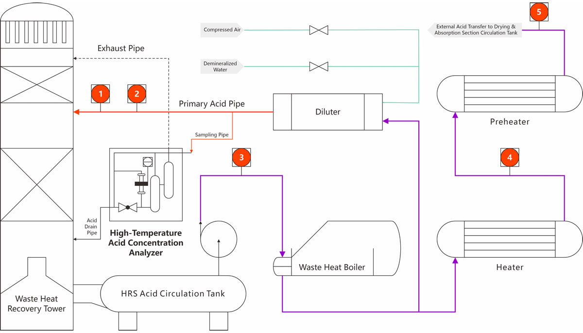 These devices are suitable for a variety of measurement locations, including water regeneration, dry acid concentration measurement, first absorption acid concentration measurement, second absorption acid concentration measurement, finished acid concentration measurement, and acid concentration measurement in waste heat recovery systems.
