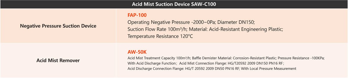 In the production process of sulfuric acid, the drying cycle tank and the secondary suction cycle tank are resolved in the cycle tank because of the saturated SO2 dissolved in the sulfuric acid. The concentration of sulfuric acid can be adjusted by adding water to the circulating tank. However, due to the intense reaction of water and acid, heat is released, which causes part of the water added to the circulating tank to evaporate into water vapor. Therefore, during the production process, the upper region of the acid circulation tank level will produce a mixture of resolved SO2, water vapor and acid fog. In the sulfuric acid production process, the drying cycle tank and the secondary suction cycle tank are resolved in the cycle tank because of the saturated SO2 dissolved in the sulfuric acid. The concentration of sulfuric acid can be adjusted by adding water to the circulating tank. However, due to the intense reaction of water and acid, heat is released, which causes part of the water added to the circulating tank to evaporate into water vapor. Thus, during the production process, a mixture of SO2 resolved, water vapor, and acid fog is produced in the upper region of the acid circulation tank level.