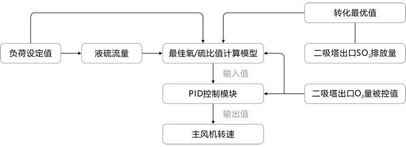 當焚硫爐出口SO2濃度確認后,裝置在運行過程中同時會綜合轉化效率來確認最佳氧/硫比值實現裝置效率最佳。氧/硫比的兩個變量是硫磺和空氣,硫磺的量是由于裝置負荷確定的,在自動控制中設定為固定變量。氧是由風機提供的空氣流量(簡稱風量),在自動控制中風量會隨環境大氣壓、溫度、濕度和風機轉速而引起變化,因此,把風量設定為動態變量。氧/硫比的控制量為穩定風量,當環境參數和負荷發生變化后自動調節風機轉速來實現設定的最佳氧/硫比值。