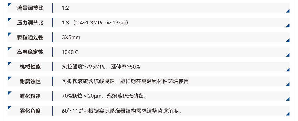 噴咀內件采用Hastelloy alloy和Stellite合金有效抵抗液硫雜質磨損與高溫稀硫酸腐蝕。可在1100℃連續工況下,流線型流道設計減少滯留區,避免局部過熱結焦。