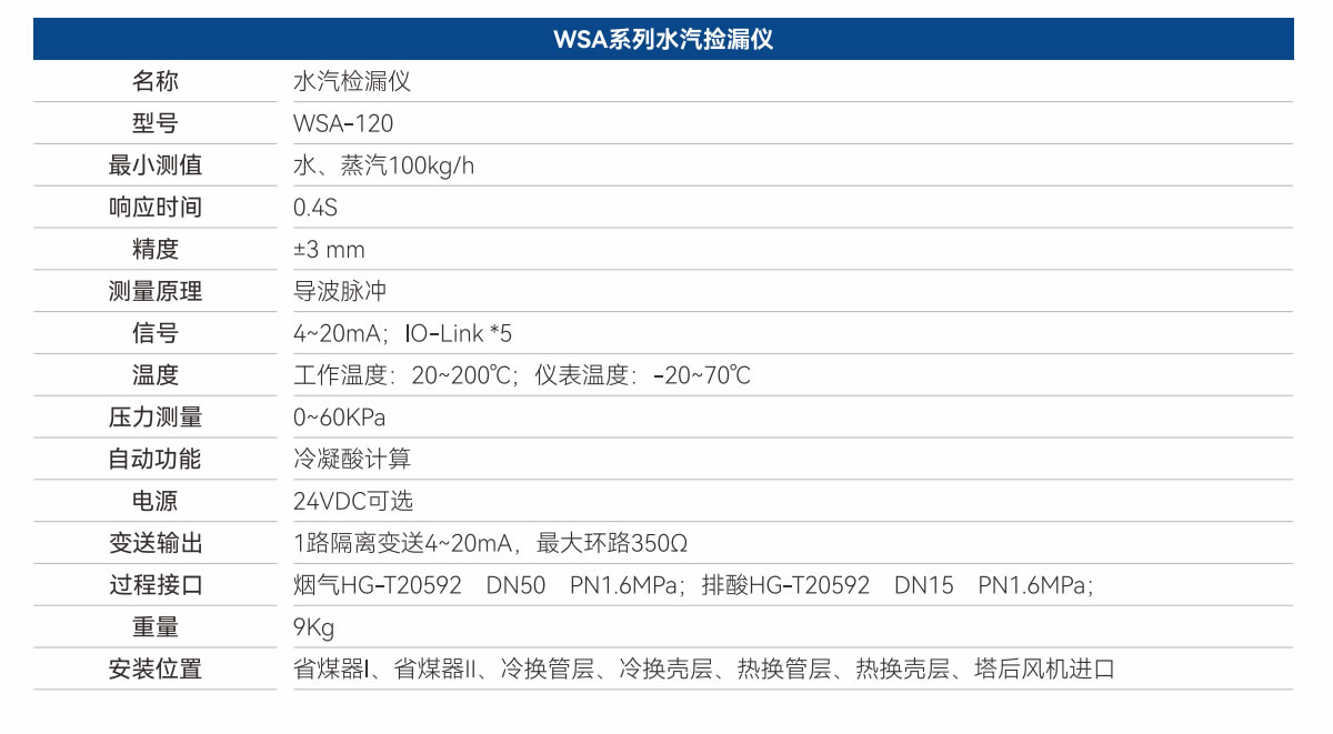 基于上述問題WSA-120水汽檢漏儀是第三代產品可以準確檢測系統中是否有水、汽的泄漏。采用了高精度脈沖檢測技術、擁有自泄漏計算模型是一款安全且環境友好的硫酸裝置專用儀表。適用于硫磺制酸鍋爐系統水汽泄漏自動檢測,Ⅰ、Ⅱ省煤器環境友好且安全免維護的硫酸裝置專用設備。