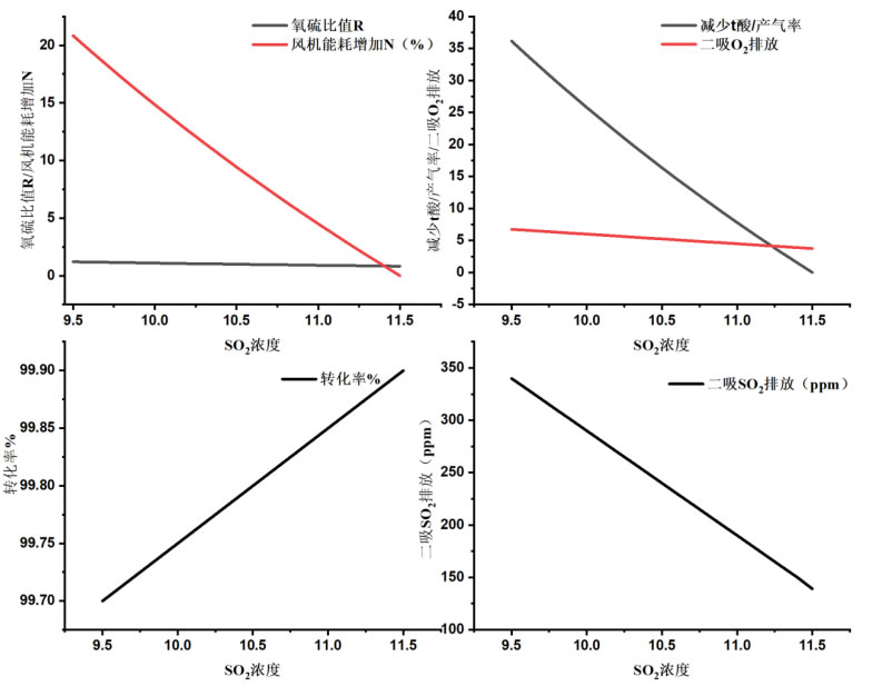 The design of the domestic sulfur acid making plant is usually set at the sulfur dioxide concentration f (SO2) of 11.5%, which corresponds to a specific oxygen sulfur ratio R=0.824. However, the ideal O2 / S ratio for each unit actually depends on the specific properties of the unit, including factors such as the type of catalyst used, the gas flow rate of the converter, the pressure of the fan, and the process flow. These factors ultimately determine the sulfur dioxide emission concentration at the outlet of the secondary suction tower. The emission concentration is affected by the conversion rate, and the main factor of the reduction of the conversion rate is the reduction of the oxygen content in the converter. Therefore, the optimal oxygen-sulfur ratio is the moment when the economic performance of the device is optimal, and the ratio of the minimum oxygen (air) required by the device to sulfur is the optimal oxygen-sulfur ratio. Figure 2 shows the relationship between the environmental economy of the plant conversion rate and the energy efficiency of the plant. Each plant can choose the most appropriate oxygen/sulfur ratio R according to its own characteristics.
