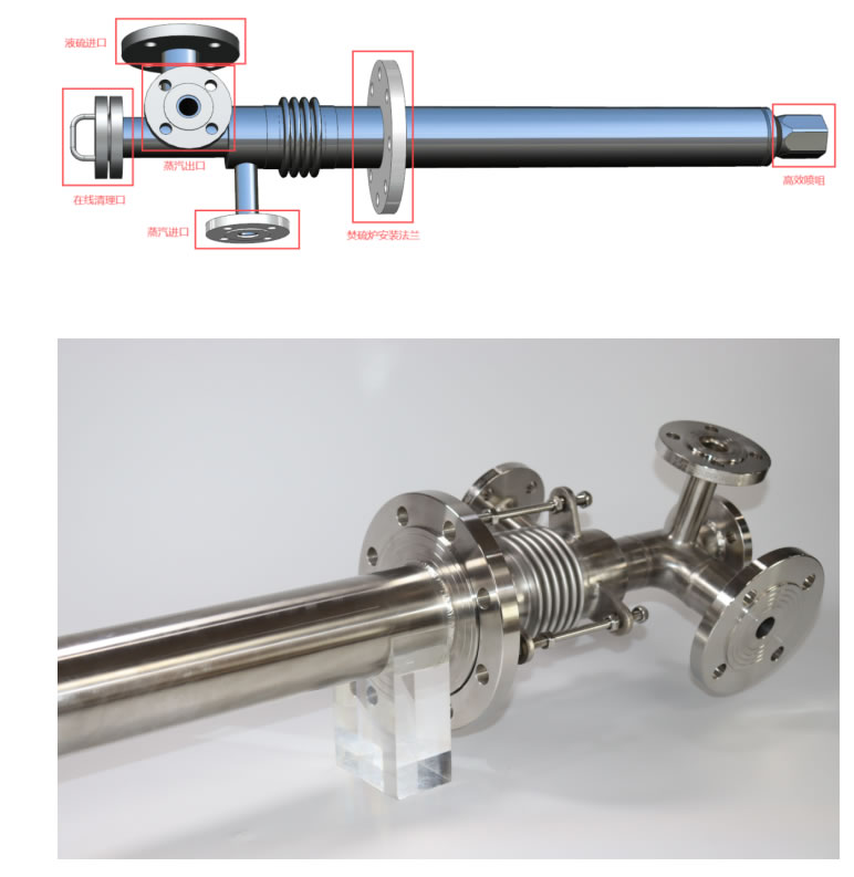 硫磺制酸裝置常因異物、硫化鐵和雜質等堵塞磺槍噴嘴,導致裝置被迫停車更換磺槍,每次停車至少造成4小時的生產中斷。因此,磺槍的在線清理技術顯得尤為重要。我們通過優化高效磺槍的結構,實現了磺槍的在線清理。該結構改進后,由于液硫進口位于磺槍側面,拆卸和安裝時只需直接拆卸螺栓即可取下磺槍,無需像傳統磺槍那樣拆卸焚硫爐的部分液硫管線才能從爐子上取下磺槍。這種設計提供了更便捷的安裝和拆卸方式,使磺槍的安裝時間從2小時縮短至30分鐘。以下是第四代在線清理高效磺槍的示意圖: