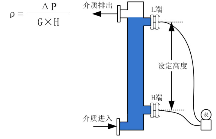設(shè)定壓力變送器的兩膜片間距固定,將壓力變送器傳感器安裝在H端的水平位置下方;完成儀表調(diào)零后,灌入介質(zhì),使其完全淹沒L端膜片,測得壓力值,即可計算得出介質(zhì)的密度。