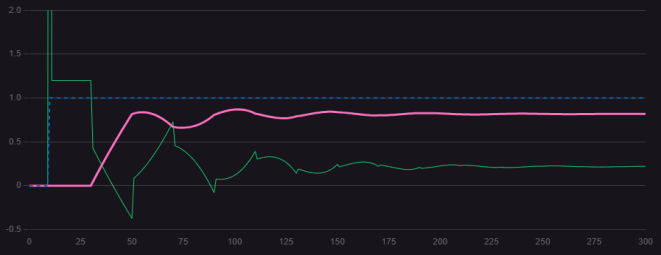 只有比例增益的控制曲線與上文提到的閾值判斷法并無顯著差異,甚至過小或過大的比例增益效果還不如閾值判斷法。在此基礎上,引入積分和微分控制,其中積分系數對應于控制曲線下方的面積,這個面積值代表相應時間段的誤差累計。將該累計值乘以系數進行變換后,疊加到輸出上,可在一定程度上消除穩態誤差,提升系統穩定性。積分時間與積分作用成反比。接下來,將展示并分析有比例作用參與的積分控制曲線,探討積分在控制曲線中的具體作用。