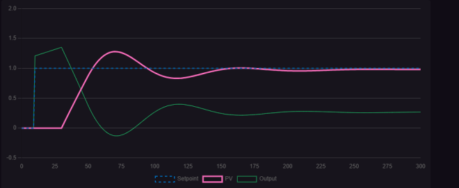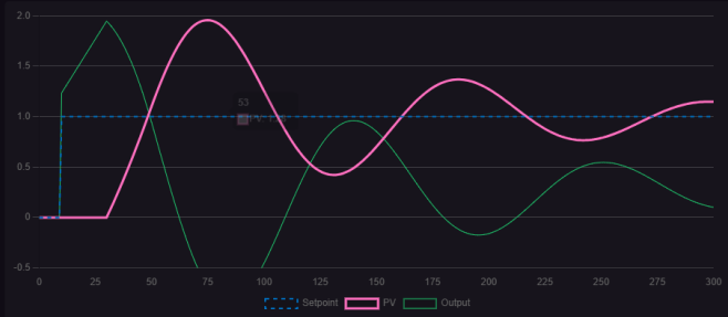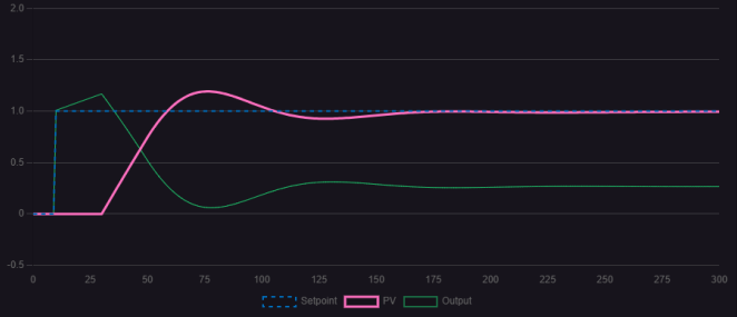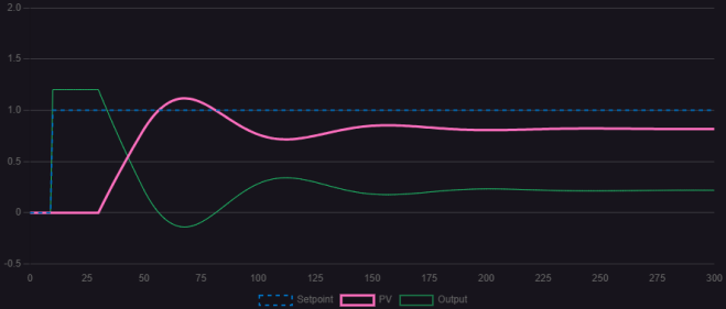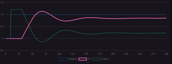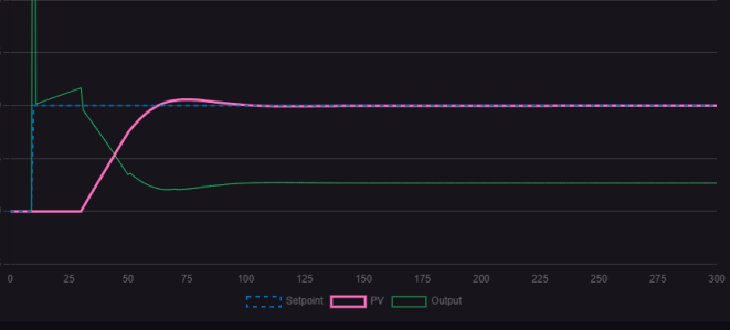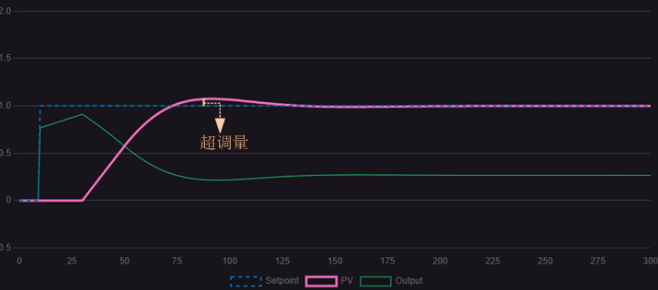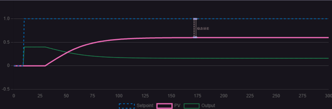 觀察三幅圖,與僅含比例增益的控制曲線圖相比,較小的積分作用對穩態誤差有一定的消除效果,但并不顯著;隨著積分作用的增強,可以看到控制曲線與目標線逐漸重合,穩態誤差基本消除。然而,繼續加大積分作用,明顯出現衰減振蕩波形,且持續時間較長,波形最終仍會趨于目標值。因此,積分作用能夠有效消除穩態誤差,但過大的積分作用會導致動態響應變慢,出現長周期的衰減振蕩。在實際控制過程中,允許過程變量(PV)在一定范圍內波動。選擇適當的比例作用可以加快調節速度,但會伴隨一定的超調量,需確保該超調量在生產誤差允許范圍內,以實現控制系統的穩定、準確和快速響應。圖1.2.4展示了在適宜比例作用下的控制曲線。