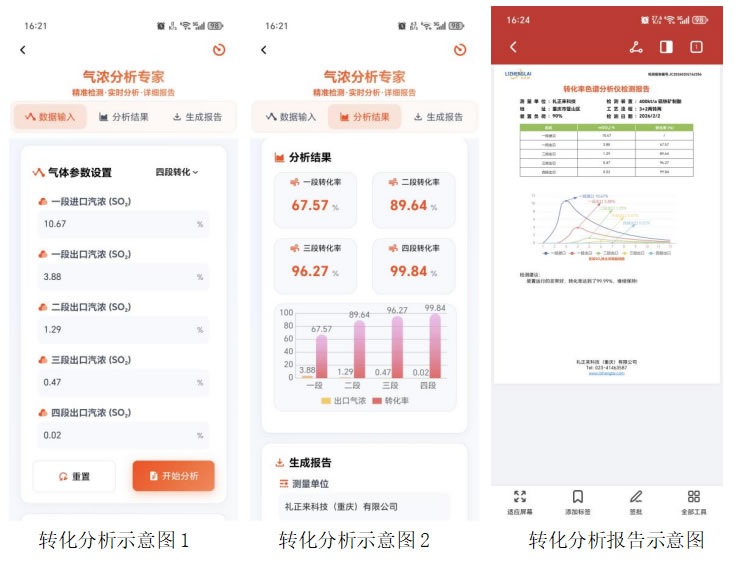 我司全新推出的“轉(zhuǎn)化分析”功能,專為精細(xì)化評估轉(zhuǎn)化器運(yùn)行效能而設(shè)計。在“數(shù)據(jù)輸入”版塊,用戶可根據(jù)實(shí)際工藝情況,選擇四段或五段轉(zhuǎn)化模式,并輸入各段出口氣體濃度,系統(tǒng)將依據(jù)專業(yè)計算公式,精準(zhǔn)得出每段的轉(zhuǎn)化率;在“分析結(jié)果”版塊,將為您提供清晰的數(shù)值結(jié)果與趨勢圖表,全面展現(xiàn)各段轉(zhuǎn)化效率及轉(zhuǎn)化器各層的健康運(yùn)行狀態(tài);在“生成報告”版塊,支持生成結(jié)構(gòu)化檢測報告——涵蓋測量單位、檢測地址、裝置工況、工藝流程、裝置負(fù)荷等關(guān)鍵信息,并允許檢測人員添加專業(yè)建議,形成完整、可追溯的檢測閉環(huán)。