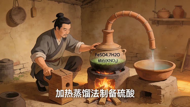 中國唐代(650—683 年),煉丹家孤剛子在《黃帝九鼎神丹經訣》記載 “煉石膽取精華法”,干餾膽礬(硫酸銅)制得稀硫酸,稱 “綠礬油”。