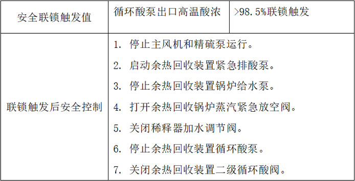 請注意,在循環酸泵出口的高溫酸濃度儀發生故障時,必須在4小時內將其修復并恢復正常運行,期間可以暫時解除聯鎖。在儀表修復期間,應每隔30分鐘手動分析一次循環泵出口的酸濃度。同時,余熱回收裝置的其他安全聯鎖措施不得被解除。