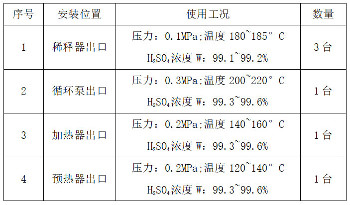 設計了三臺高溫酸濃分析儀,用于稀釋器出口的測量工作。具體測量工況如下: