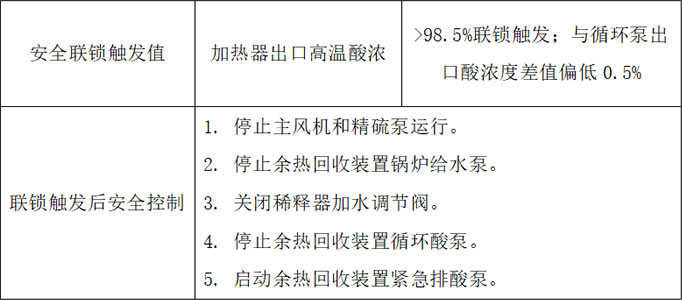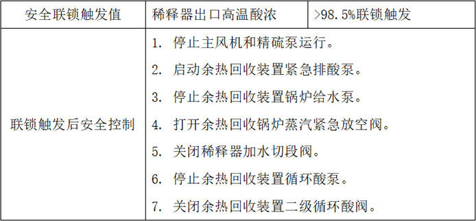 當硫酸裝置或余熱回收裝置內部發生嚴重泄漏,或者稀釋器加水酸濃控制失效,導致余熱回收裝置內部硫酸濃度降至安全值以下時,安全聯鎖系統將被觸發,使裝置停車并恢復至安全狀態。這一措施旨在保護裝置免遭重大腐蝕,避免企業長時間停產。