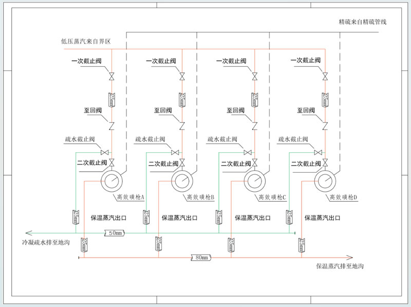 4、同時保持磺槍保溫蒸汽出口放空地溝,用于檢查磺槍是否存在液硫泄漏。