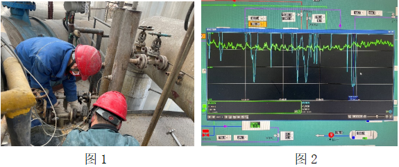 該客戶為四川某大型磷化企業(yè),有兩套400Kt/a硫黃制酸裝置,一級吸收均采用的余熱回收系統(tǒng)。在稀釋器出口,選用了兩套羅斯蒙特電導(dǎo)率傳感器和56E變送器,組合測量硫酸濃度。由于測量的一級循環(huán)硫酸是稀釋后的硫酸(溫度180℃、壓力0.1MPa),為了實現(xiàn)快速將水與硫酸混合均勻,該稀釋器采用壓縮空氣霧化脫鹽水增強擾動的技術(shù)。導(dǎo)致電導(dǎo)率傳感器測量含有空氣介質(zhì)的硫酸,使得余熱回收系統(tǒng)從投用到改造前所的一級循環(huán)酸濃度測量值與實際偏離大,且測量數(shù)據(jù)波動大(見圖2).因此測量的結(jié)果無法用于保障裝置安全聯(lián)鎖和加水自動控制的要求。