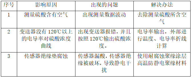 具體原因說明:由于稀釋器采用壓縮空氣霧化脫鹽水增強擾動的技術(shù),導(dǎo)致從稀釋器出來的循環(huán)硫酸含有空氣介質(zhì)。而現(xiàn)采用的電導(dǎo)率傳感器不能準確測量含有空氣介質(zhì)的硫酸濃度。當含有空氣介質(zhì)的硫酸通過電導(dǎo)率傳感器時,由于空氣不導(dǎo)電,此時測量的電導(dǎo)率非常低,并且不穩(wěn)定。由于硫酸濃度越高電導(dǎo)率越低,測量值則比實際偏大且波動大,故無法準確測量。