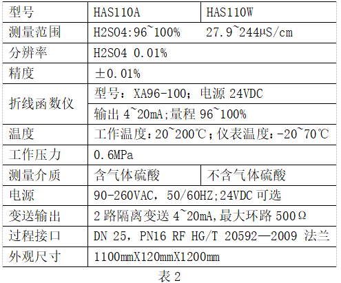 由于主管道進塔后是分酸器,所以取樣位置的壓力基本為分酸器液位靜壓。所選用的56E變送器內(nèi)置有120℃內(nèi)φ(H2SO4)96~100%電導(dǎo)率對應(yīng)的硫酸濃度曲線,可輸出硫酸濃度或電導(dǎo)率。